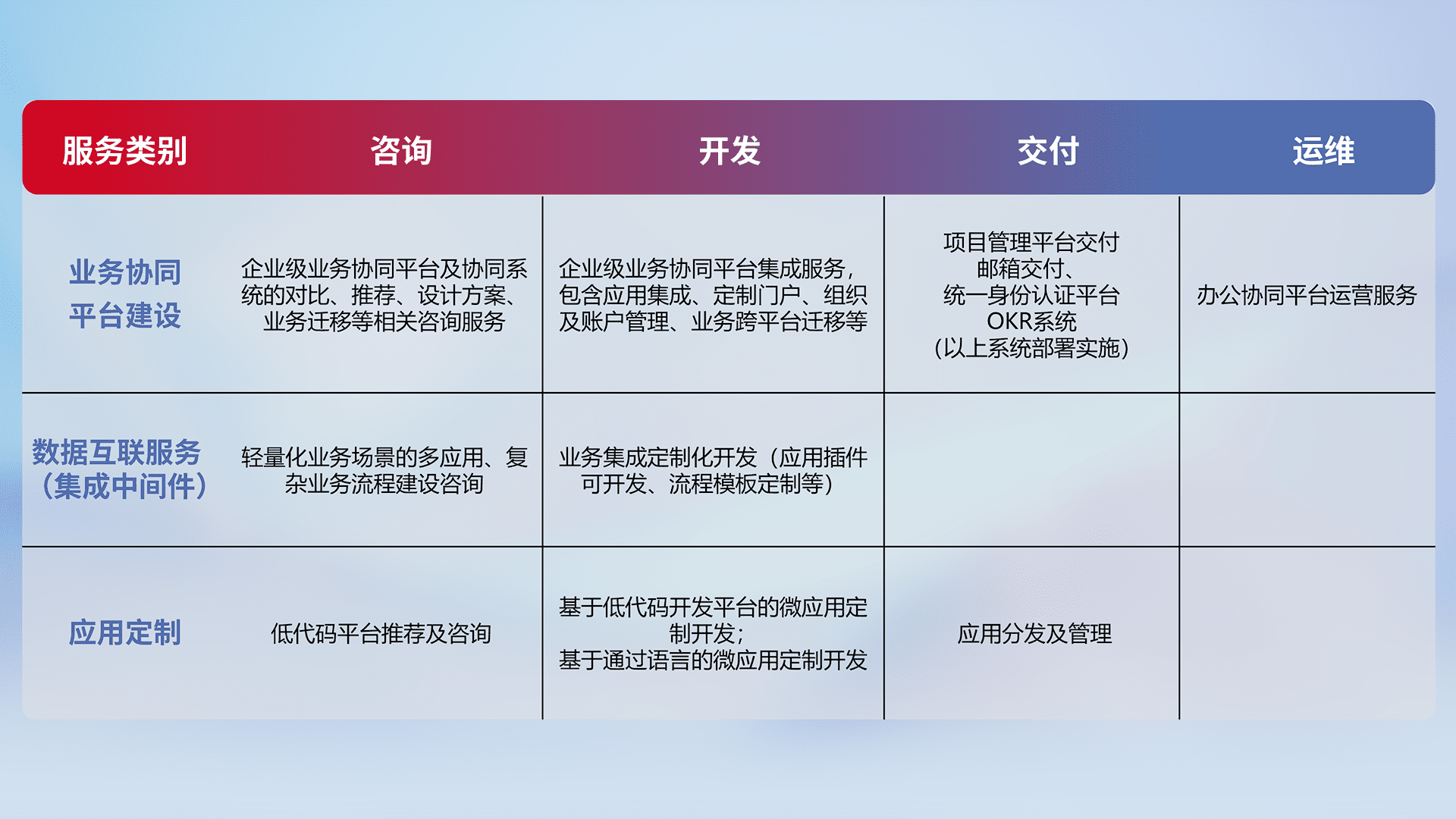 针对钉钉、、企微、、、、IDaas等平台级产品提供产品的规划、、、方案、、、交付、、定制化开发等服务,,,,实现如统一协同办公、、、智能客户服务、、混合会议管理、、、、智能数据查询、、、等业务场景,,,,实现数字化转型。。。。