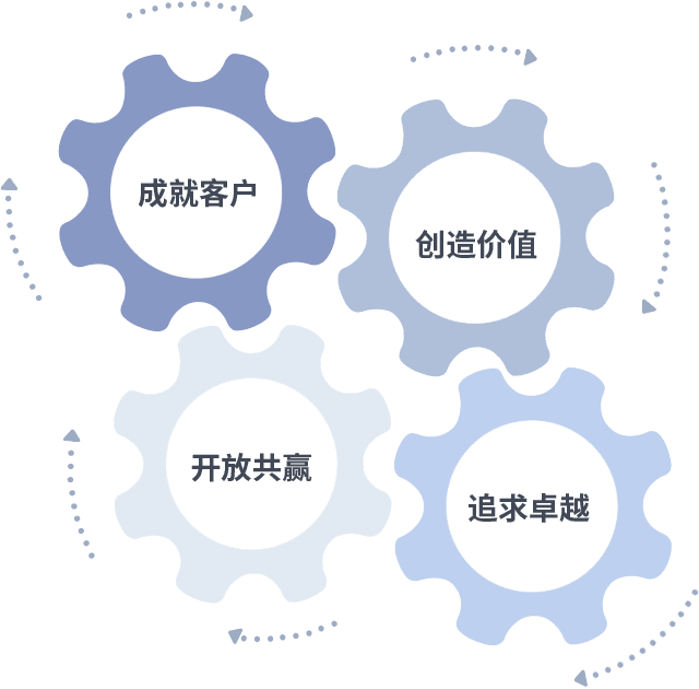 成就客户是一切决策的出发点,,,,创造价值是衡量所有工作的标准,,追求卓越是我们做事做人的态度,,,开放共赢是我们的格局也是最终的结果。。。价值观的齿轮环环相扣,,,,推动着组织里的每个人不断向前。。。